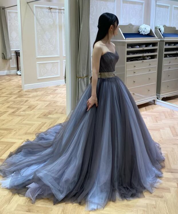 カラードレス くすみピンク ベアトップ くるみボタン サッシュベルト 光沢サテン 華やかなトレーン 花嫁 前撮り のコピー