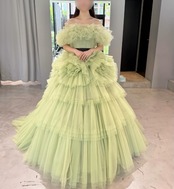 カラードレス オフショルダー 柔らかく重ねたチュールスカート サッシュベルト 編み上げ 短トレーン ミントグリーンドレス 披露宴/結婚式 前撮り