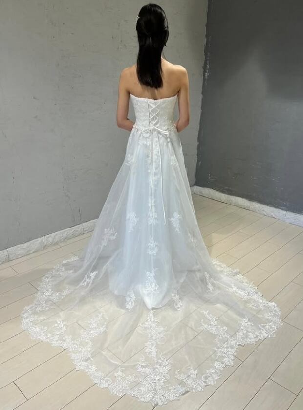 ウエディングドレス オフホワイト 繊細なレース 編み上げ 華やかなトレーン ビスチェドレス 結婚式