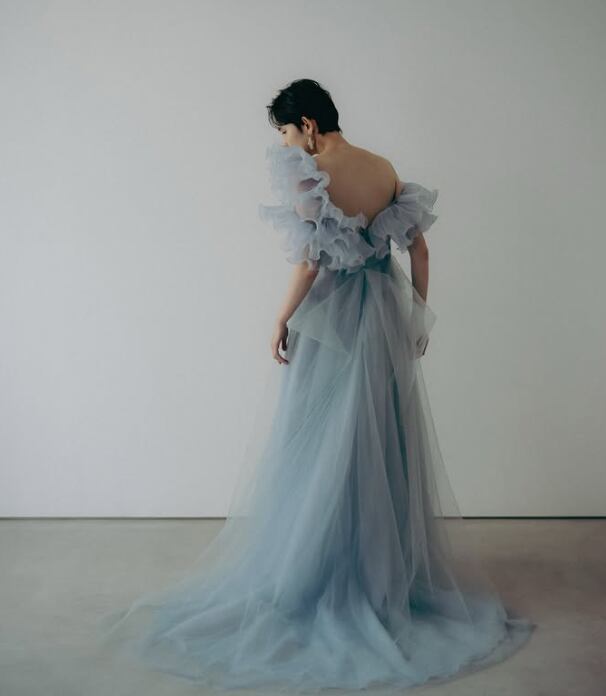 カラードレス 爽やかで優しいブルー フリルオフショルダー アシンメトリー風 バックレス 花嫁 前撮り