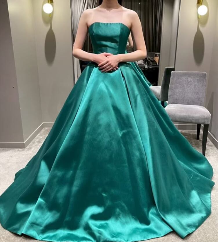 カラードレス グリーン 光沢サテン くるみボタン 色直し 華やかなトレーン 花嫁 前撮り