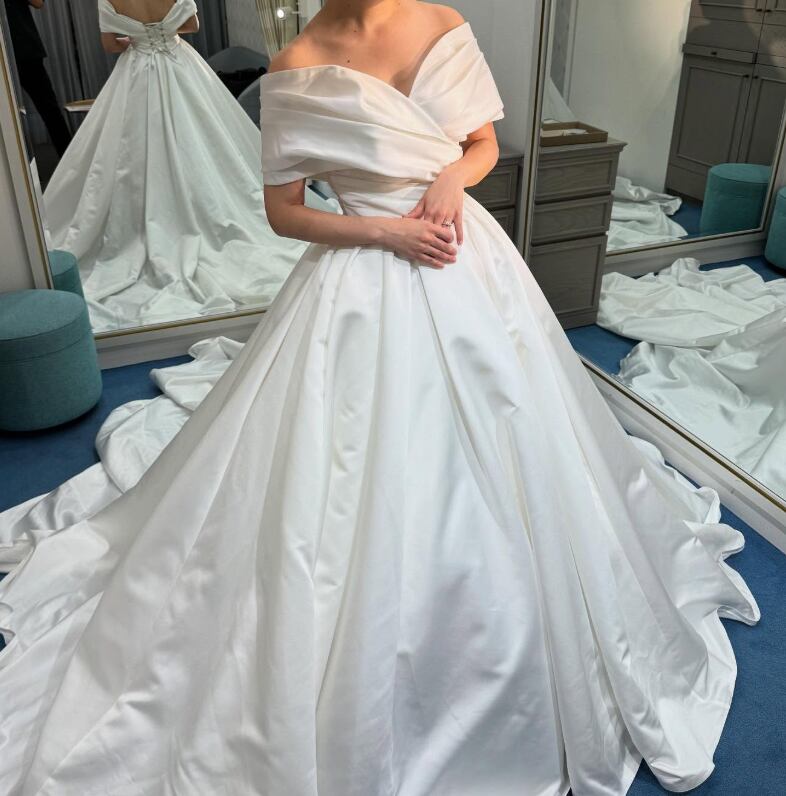 ウエディングドレス オフホワイト オフショルダー 光沢サテン アンティークなドレス 華やかなトレーン 披露宴/結婚式 前撮り