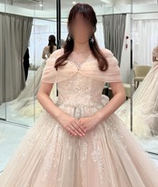 カラードレス 薄ピンク オフショルダー キラキラスパンコール 編み上げ 華やかなトレーン プリンセスライン 結婚式 前撮り