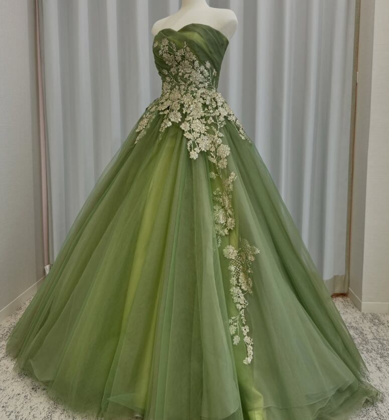 カラードレス 深めな緑 キラキラ光る刺繍 ソフトチュール 編み上げ 華やかなトレーン 花嫁 前撮り