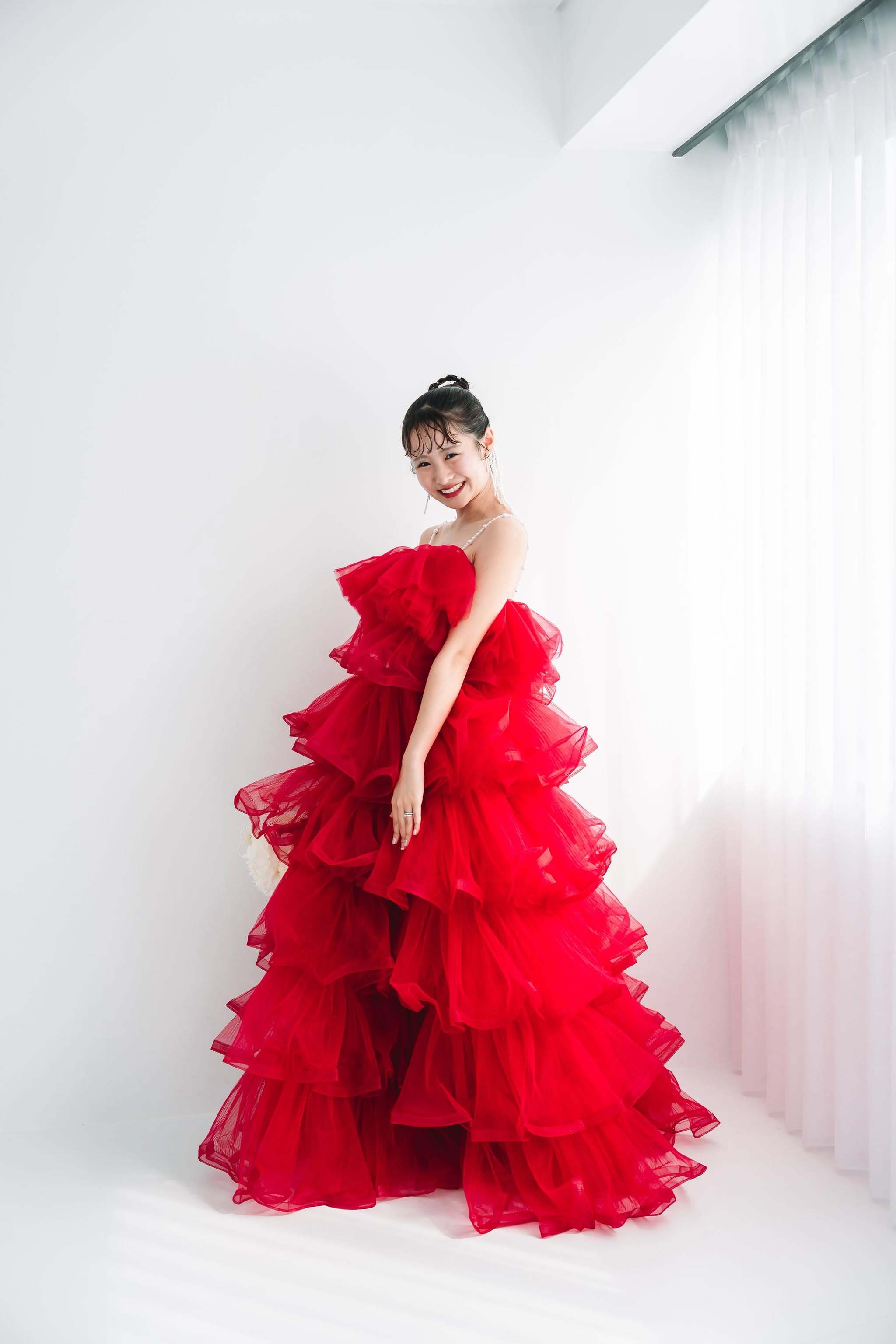 実例写真! カラードレス チェリーピンク パール キャミソール ソフトチュール 編み上げ ティアードのドレス 花嫁 前撮り