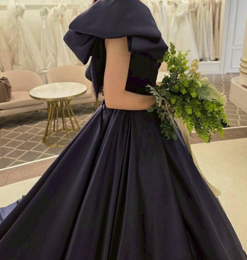 カラードレス ネイビー ショルダー型 スリット 光沢サテン 華やかなトレーン 色直し 花嫁