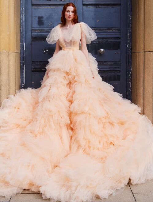 カラードレス あんず色 セクシー ふわふわ袖 柔らかく重ねたチュールスカート 華やかなトレーン バックレス 肩出し 花嫁 前撮り