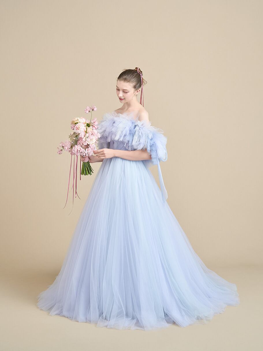 カラードレス 爽やかで優しいブルー フリルオフショルダー ソフトチュール 華やかなトレーン 绮丽な 花嫁 前撮り