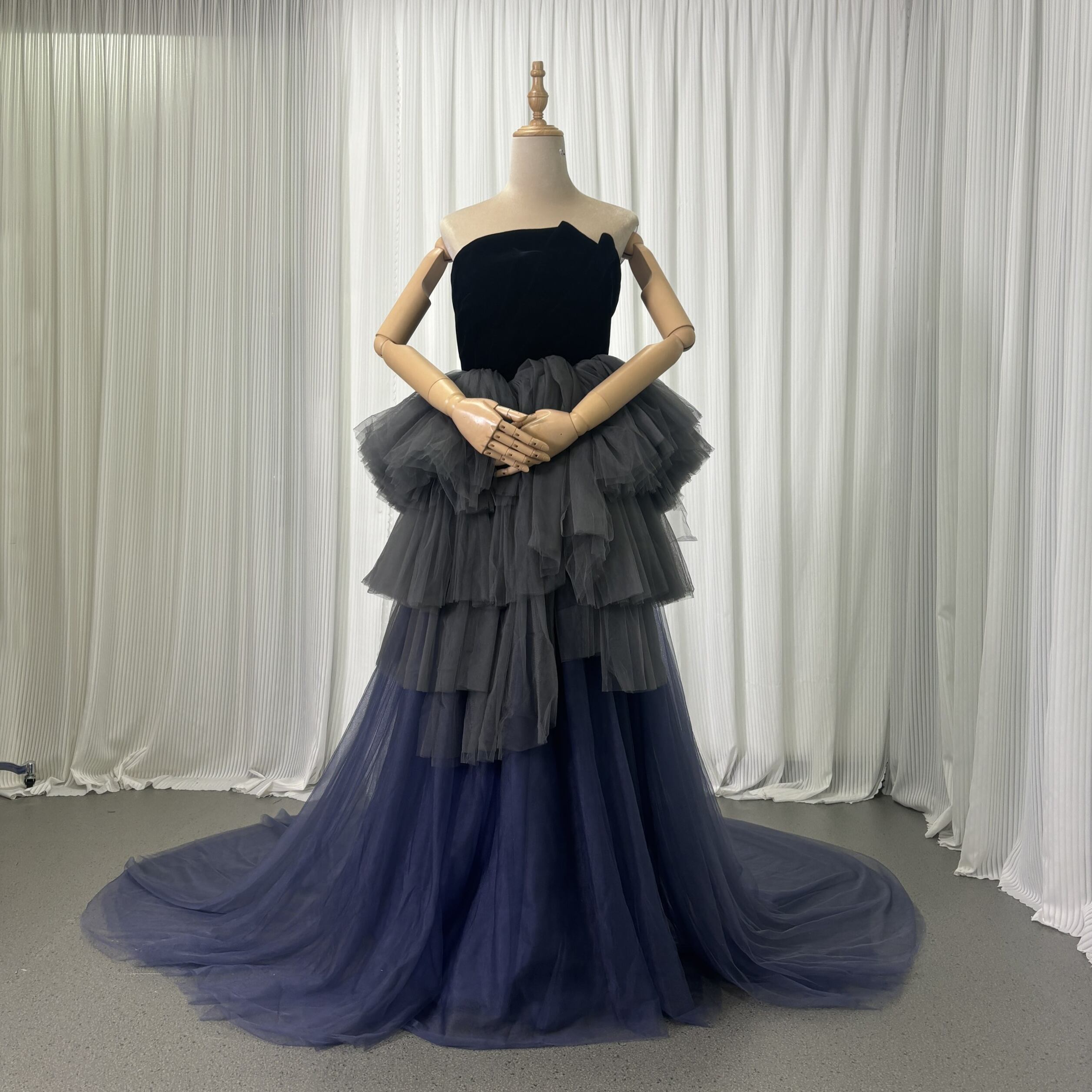 カラードレス グレー +青紫 高級ベロア ソフトチュール アシンメトリードレス ロングトレーン ビスチェドレス 花嫁
