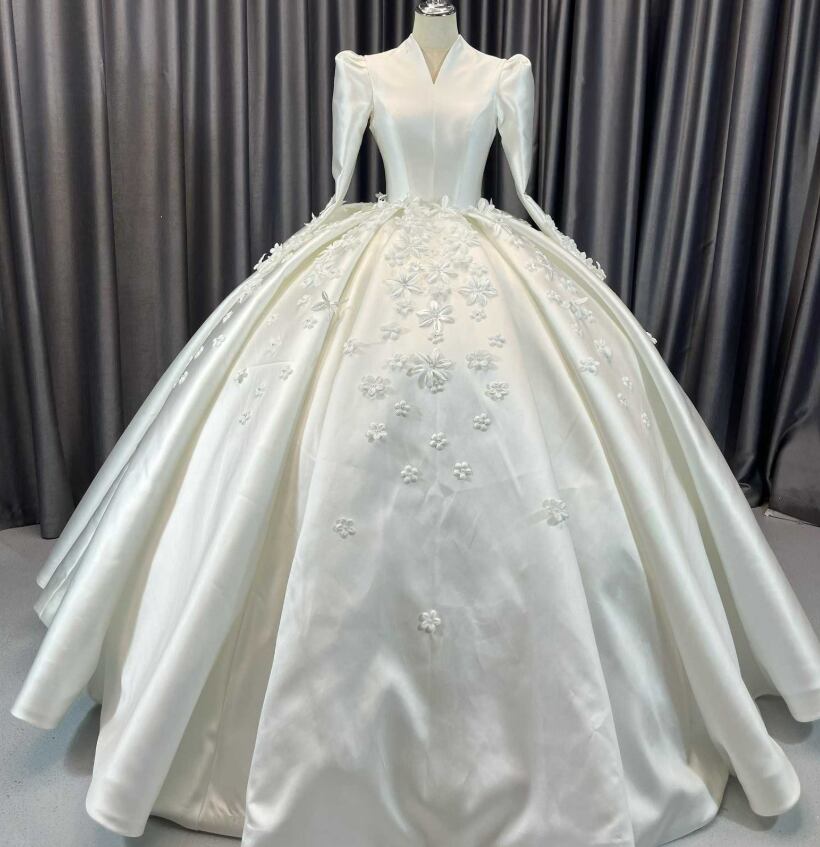 ウエディングドレス オフホワイト 光沢サテン ロングスリーブ 花モチーフ ハイネック Vネックドレス 結婚式