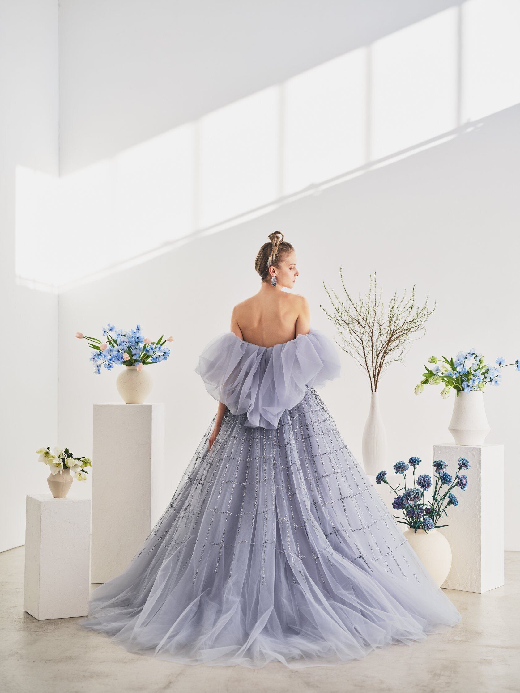 カラードレス 爽やかで優しいブルー 取り外し可能なオフショルダー キラキラ光る刺繍 華やかなトレーン 花嫁 前撮り