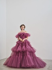 カラードレス くすみピンク 取り外し可能なオフショルダー ソフトチュール 華やかなトレーン 目立つ ティアードのドレス 花嫁 前撮り