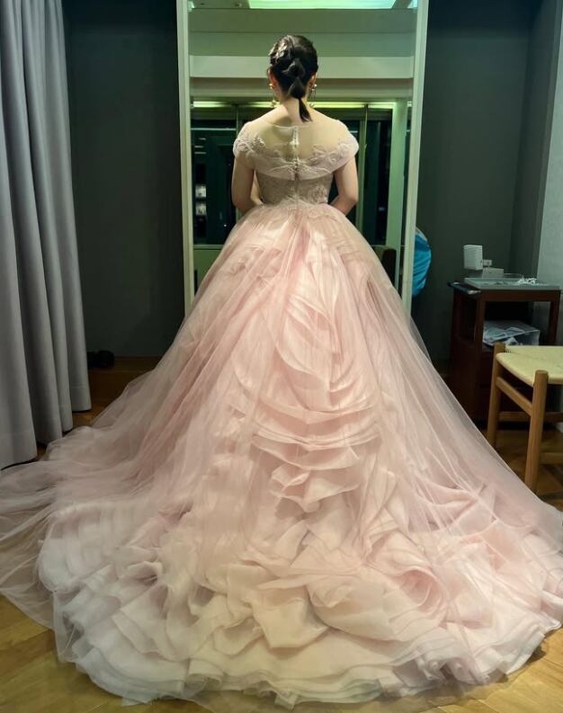 カラードレス ピンク オフショルダー キラキラのハンドビーディング 柔らかく重ねたチュールスカート 華やかなトレーン 花嫁