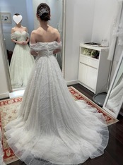 ウエディングドレス オフホワイト オフショルダー キラキラ光る刺繍 ファスナー 華やかなトレーン 結婚式