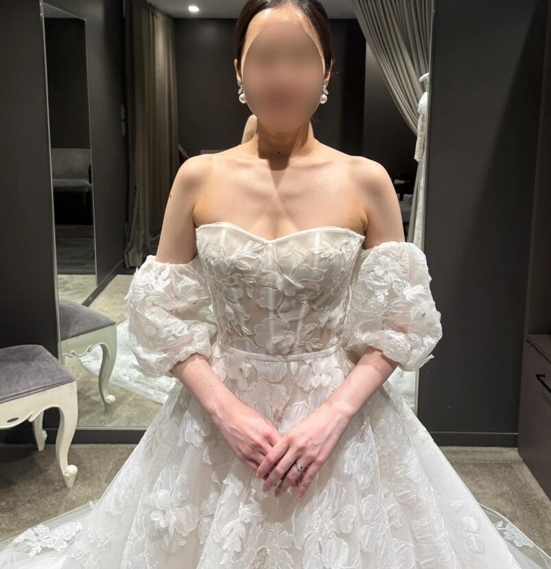 ウエディングドレス オフホワイト 取り外し可能な付け袖 花柄モチーフで刺繍が美しい 編み上げ 華やかなトレーン 結婚式