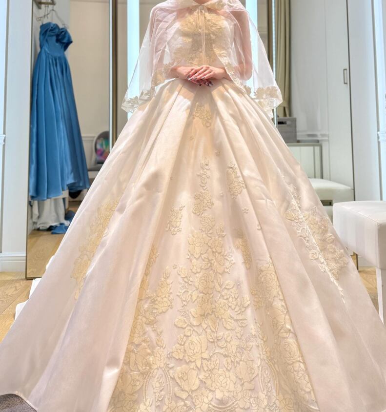 ウエディングドレス オフホワイト コート 光沢サテン 花柄モチーフで刺繍が美しい 華やかなトレーン 結婚式 前撮り
