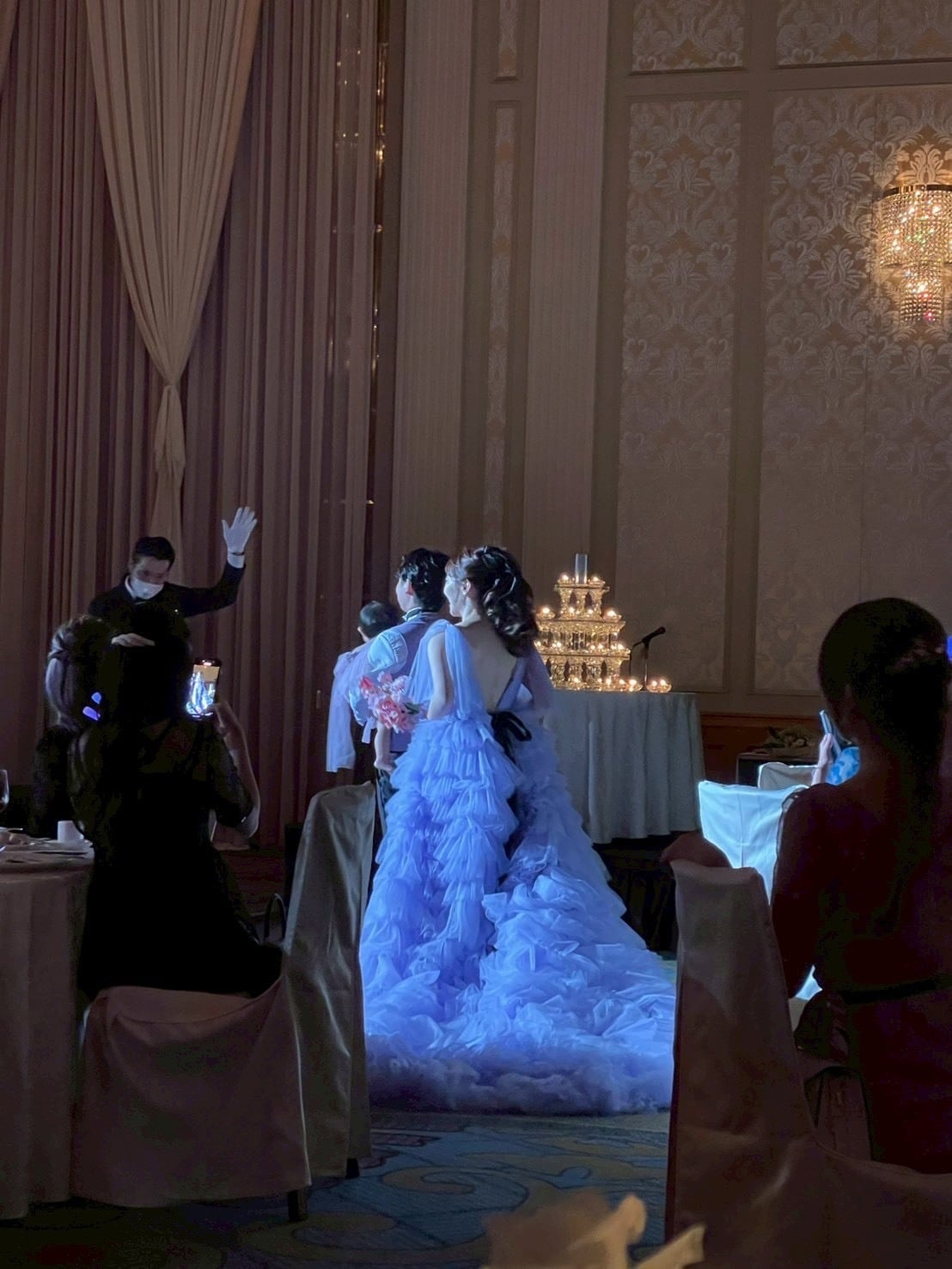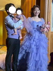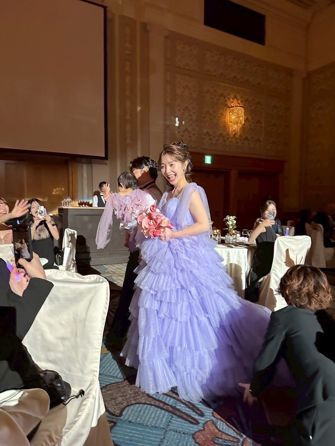 実例写真!カラードレス パープル バックレス サッシュベルト 柔らかく重ねたチュールスカート ティアードのドレス 華やかなトレーン 結婚式