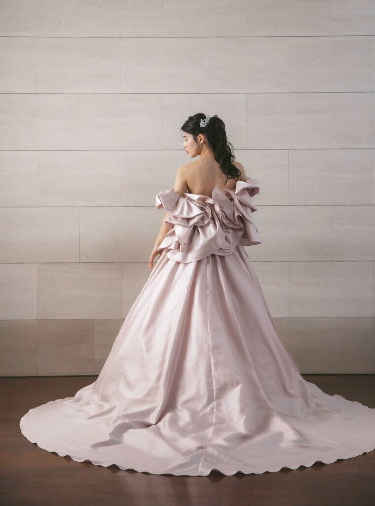 カラードレス ピンク 取り外し可能な付け袖 光沢サテン 華やかなトレーン 色直し 花嫁
