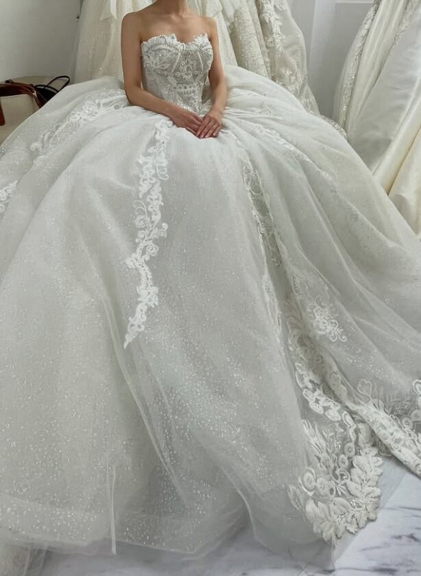 ウエディングドレス ホワイト 韓国風ドレス ベアトップ 華やかなトレーン キラキラグリッターチュール 繊細レース パール 披露宴/結婚式