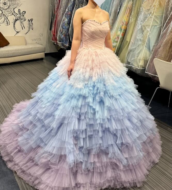 カラードレス レインボー スリット ベアトップ 編み上げ 柔らかく重ねたチュールスカート 華やかなトレーン 花嫁 前撮り 目立つ