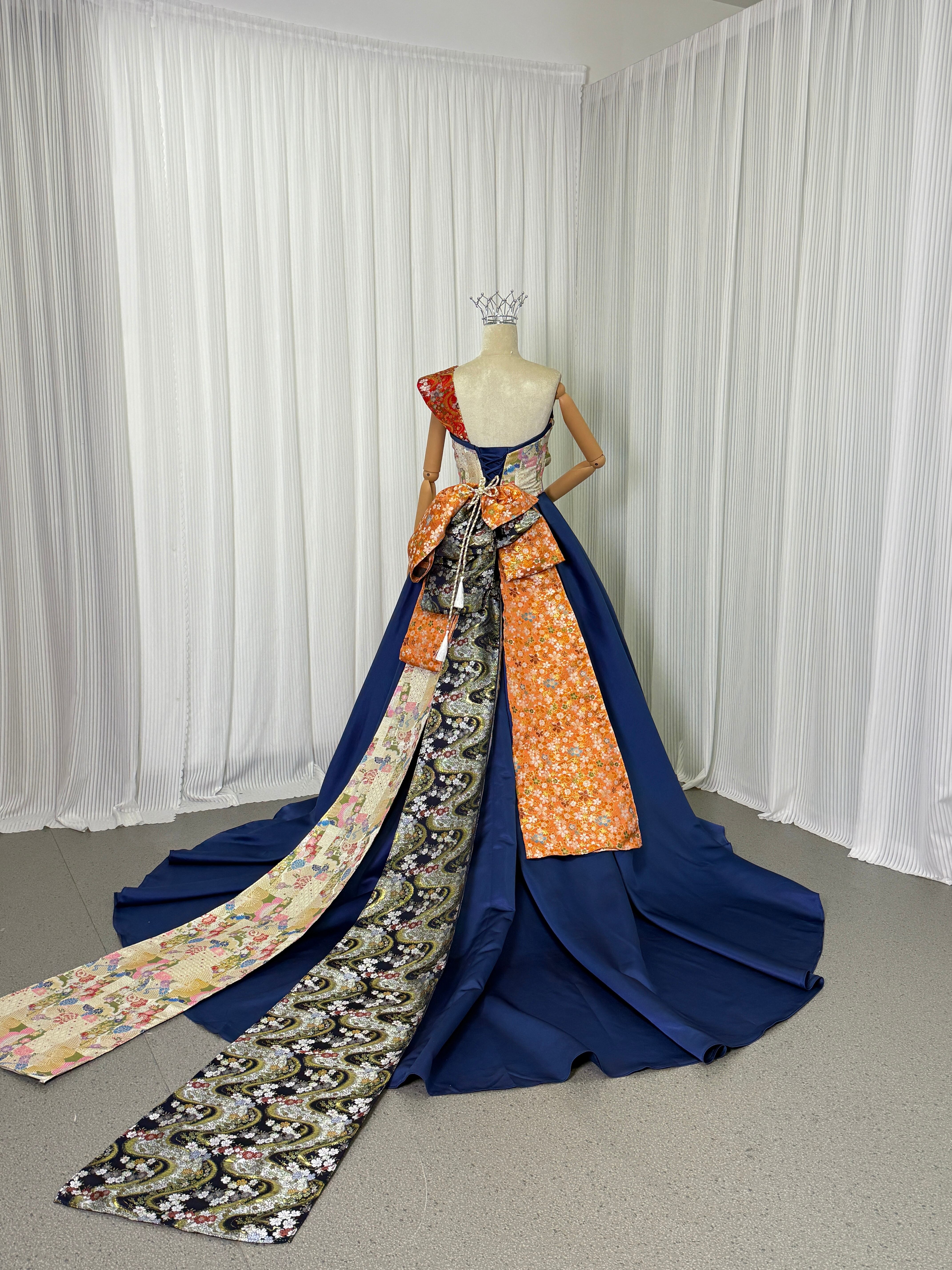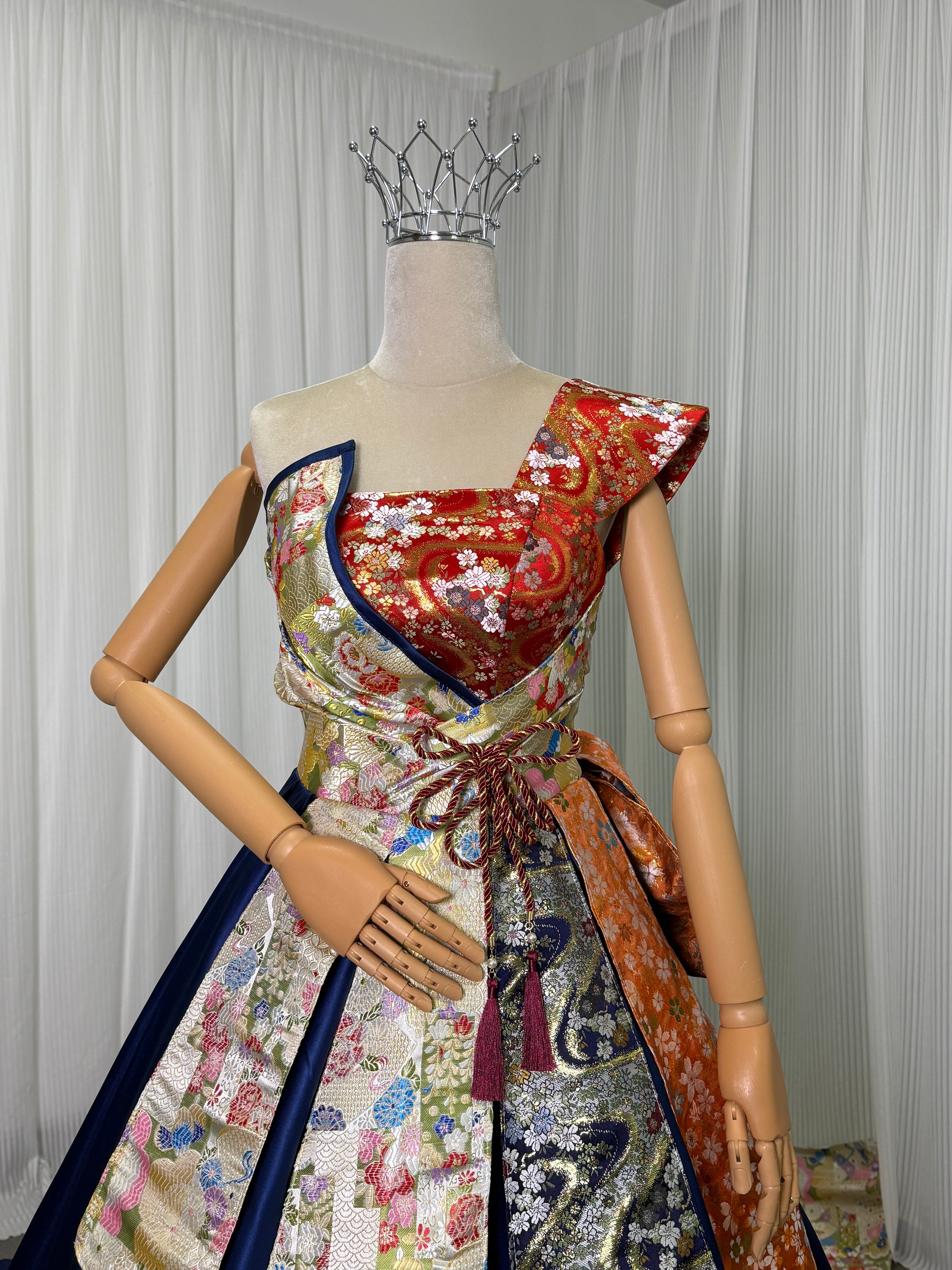 着物ドレス、和ドレス ワンショルダー ふっくら柔らかなバックリボン ジャガード生地 編み上げ ネイビー