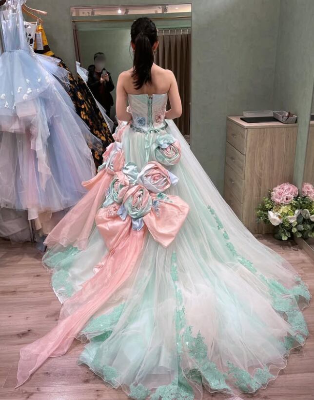 カラードレス ベアトップ 編み上げ バラトレーン 美しい花レース 上質オーガンジー 華やかなトレーン 前撮り 可愛い ミントグリーンドレス