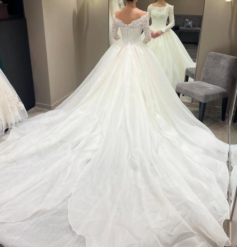ウエディングドレス オフホワイト 韓国風ドレス ロングスリーブ ファスナー 上質オーガンジー 華やかなトレーン 結婚式