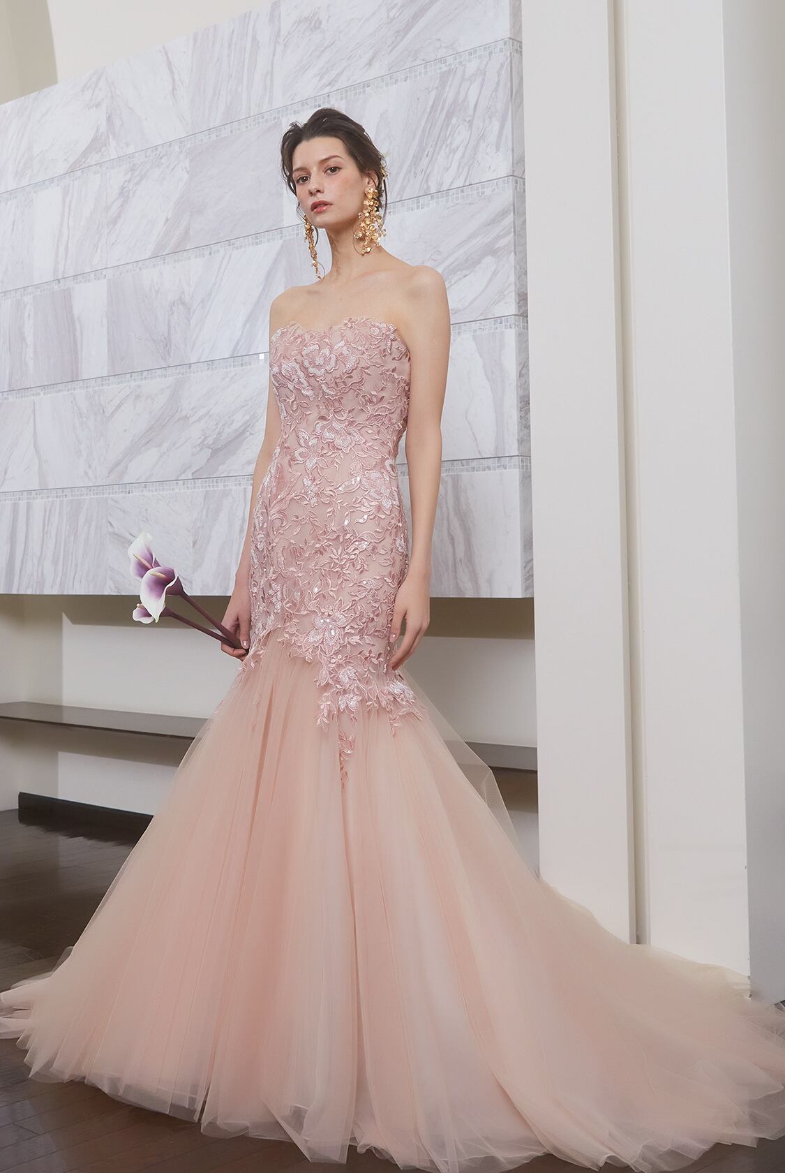 カラードレス ピンク 花柄モチーフで刺繍が美しい オンショルダードレス くるみボタン ソフトマーメイドライン 細見えシルエット 披露宴/結婚式