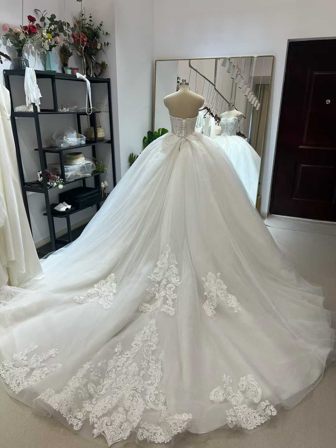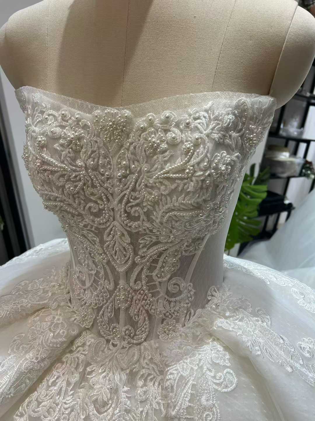 ウエディングドレス オフホワイト 韓国風ドレス 繊細なレース パール 編み上げ 柔らかく重ねたチュールスカート 華やかなトレーン ビスチェドレス 結婚式