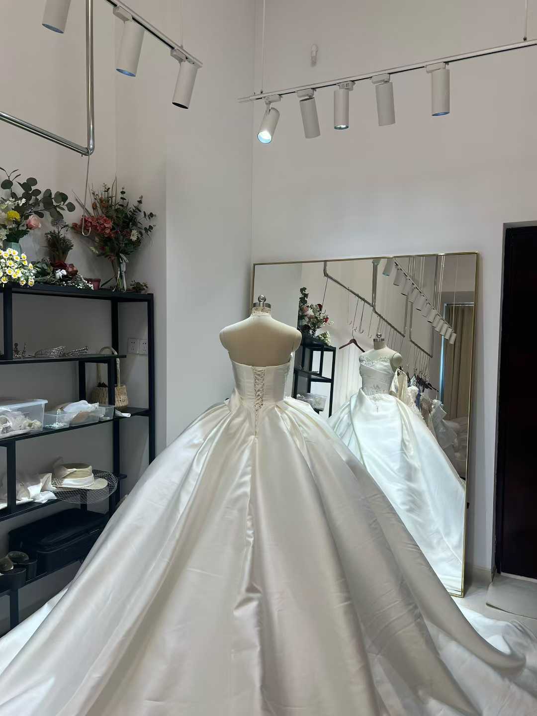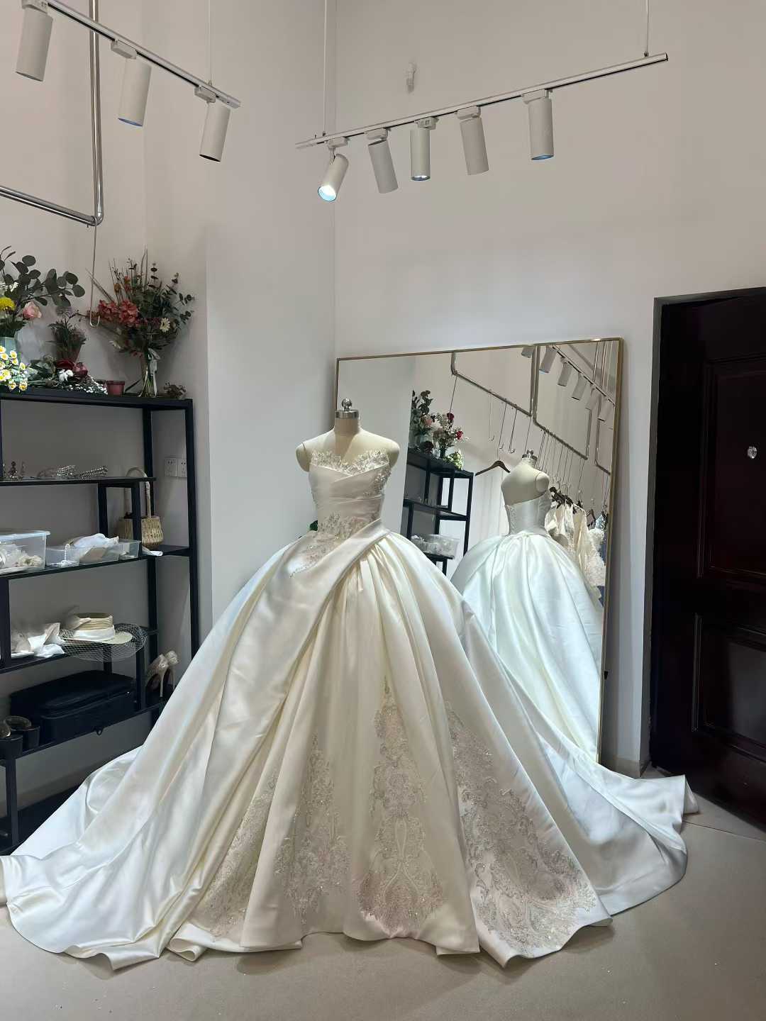 ウエディングドレス オフホワイト 韓国風ドレス キラキラのハンドビーディング 光沢サテン 編み上げ 華やかなトレーン ビスチェドレス アンティークなドレス 結婚式