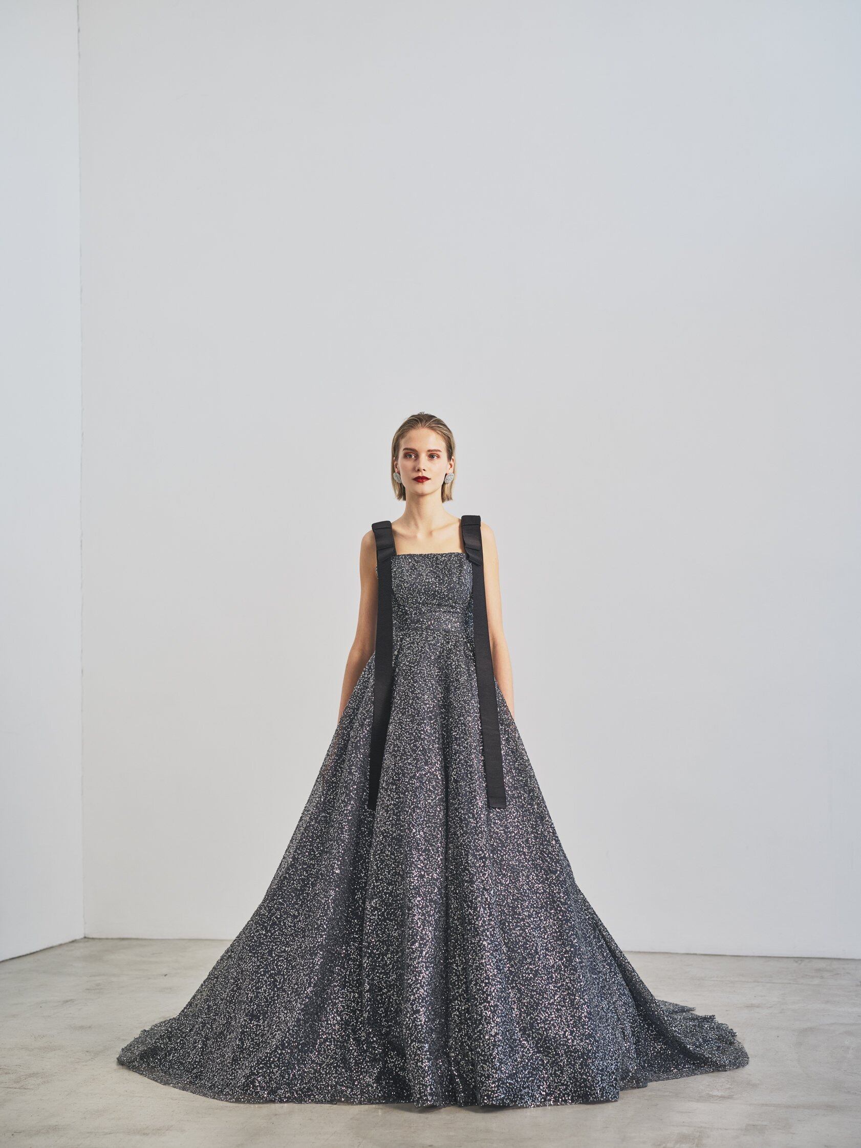 カラードレス ブラック キラキラグリッターチュール キャミソール Aライン バックレス パーティードレス