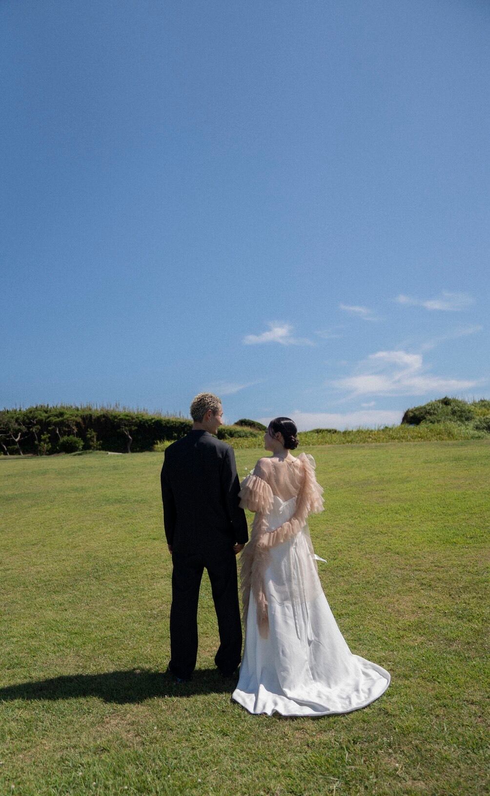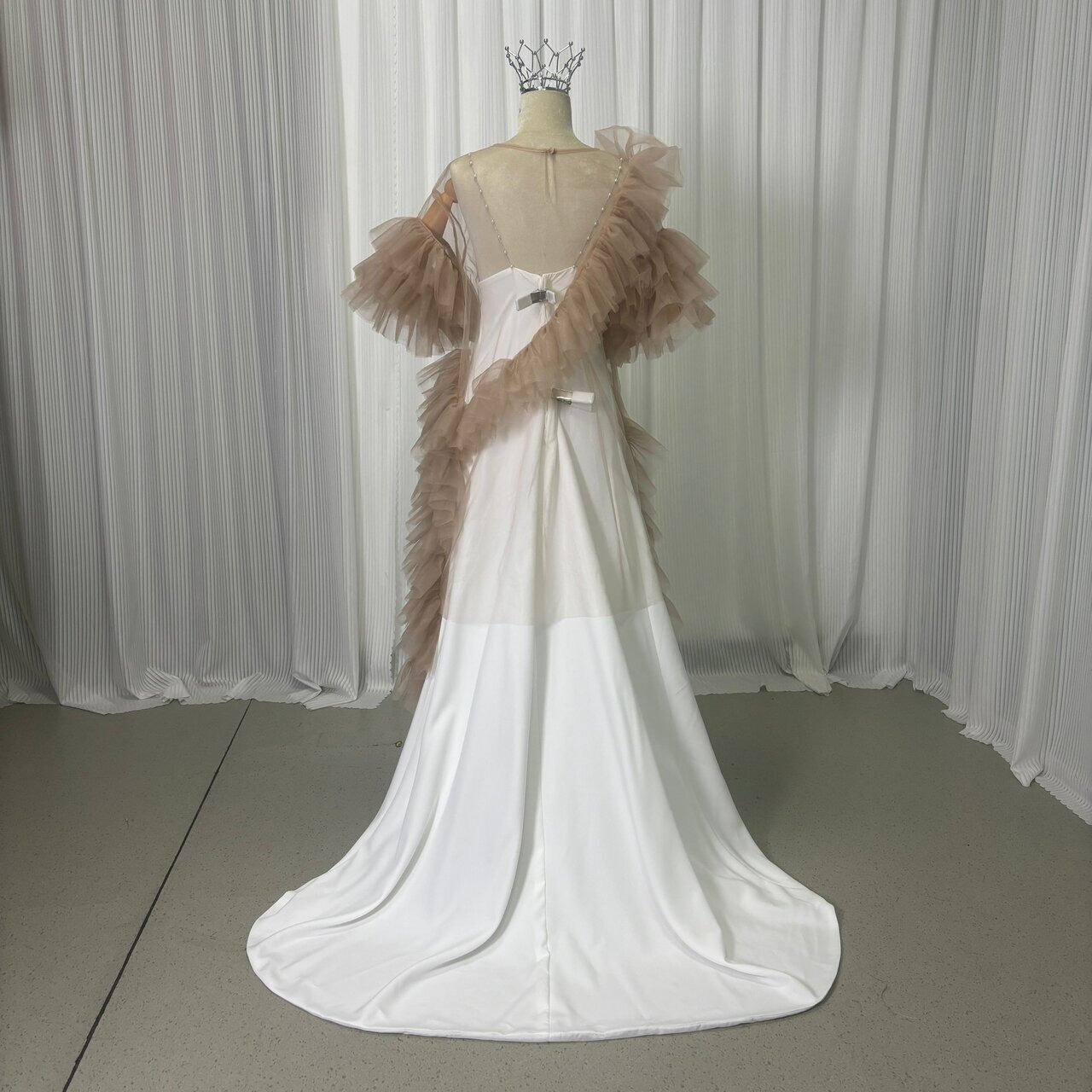 実例写真!パーティードレス オフホワイト キャミソール ロング +ブラウン ソフトチュール オーバードレス 花嫁 前撮り