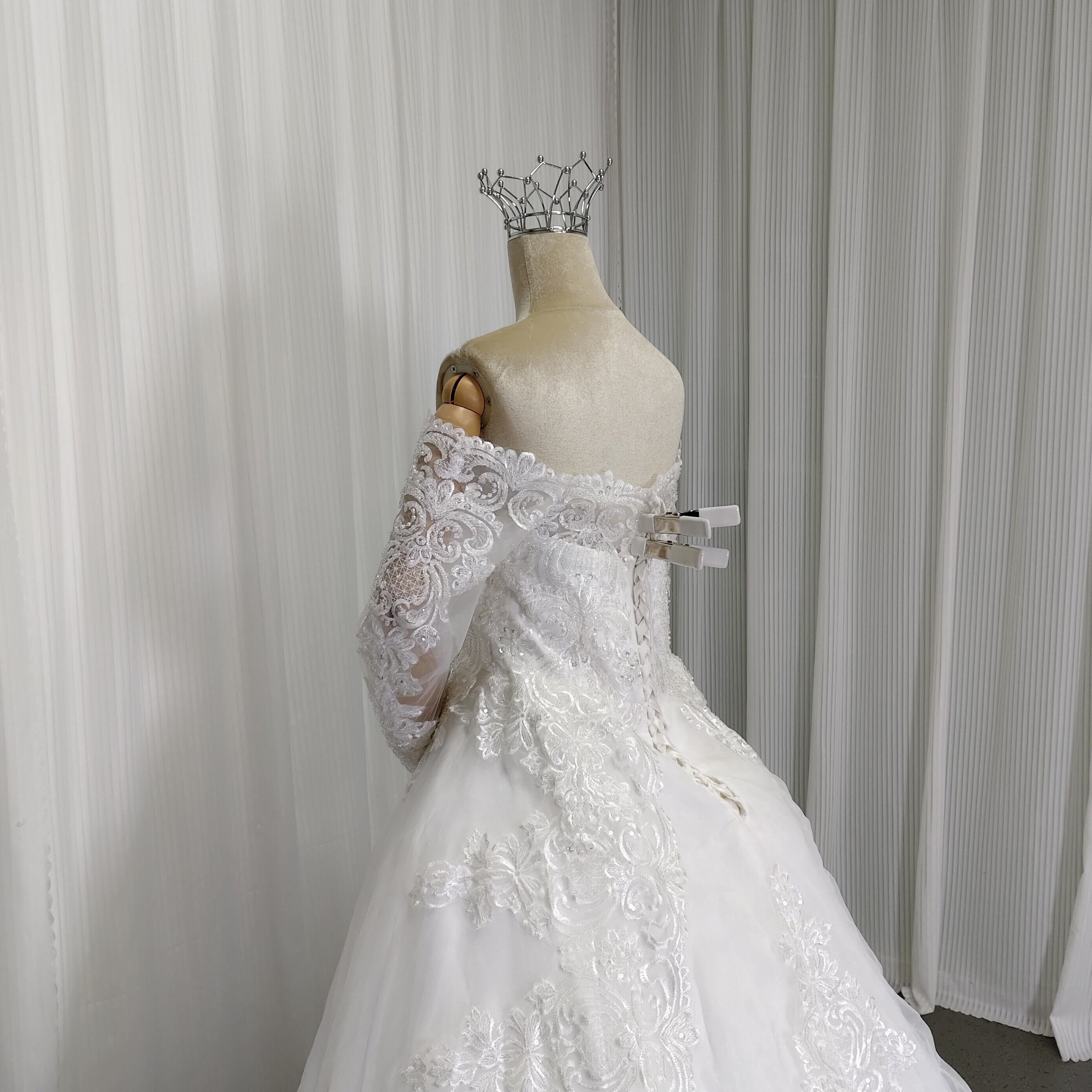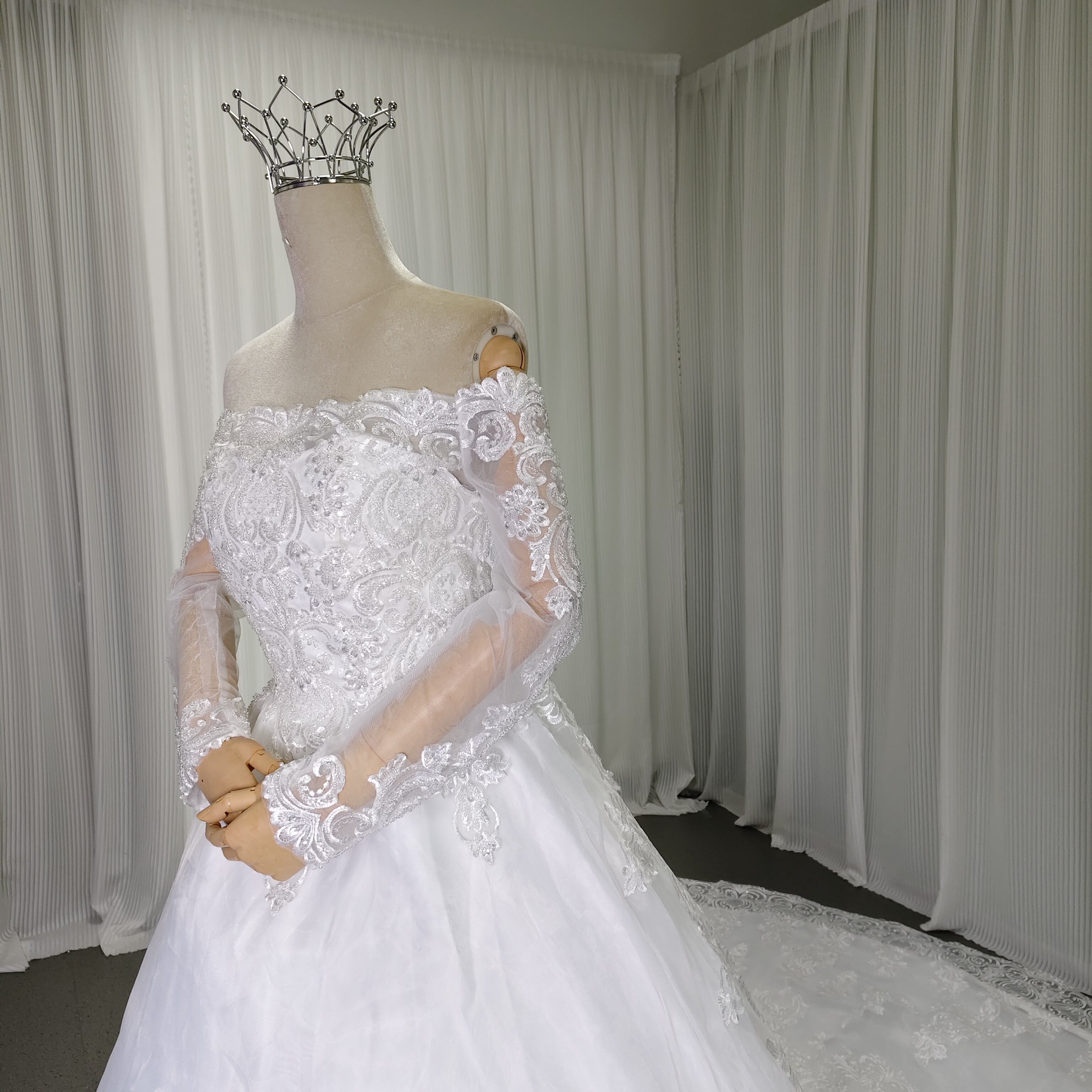 実例写真!ウエディングドレス オフホワイト ロングスリーブ 繊細なレース 華やかなトレーン 肩出し 結婚式