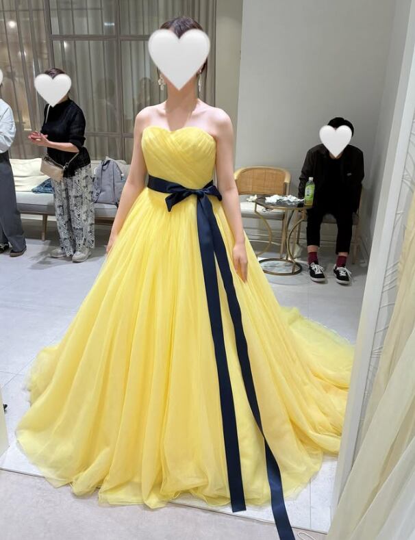 カラードレス パステルイエロー ソフトチュール 編み上げ サッシュベルト 華やかなトレーン ビスチェドレス 花嫁 前撮り