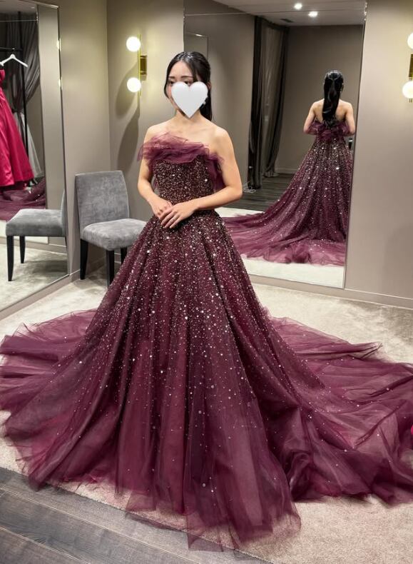 カラードレス ワインレッド シークインチュール ビスチェドレス 華やかなトレーン キラキラチュール 結婚式