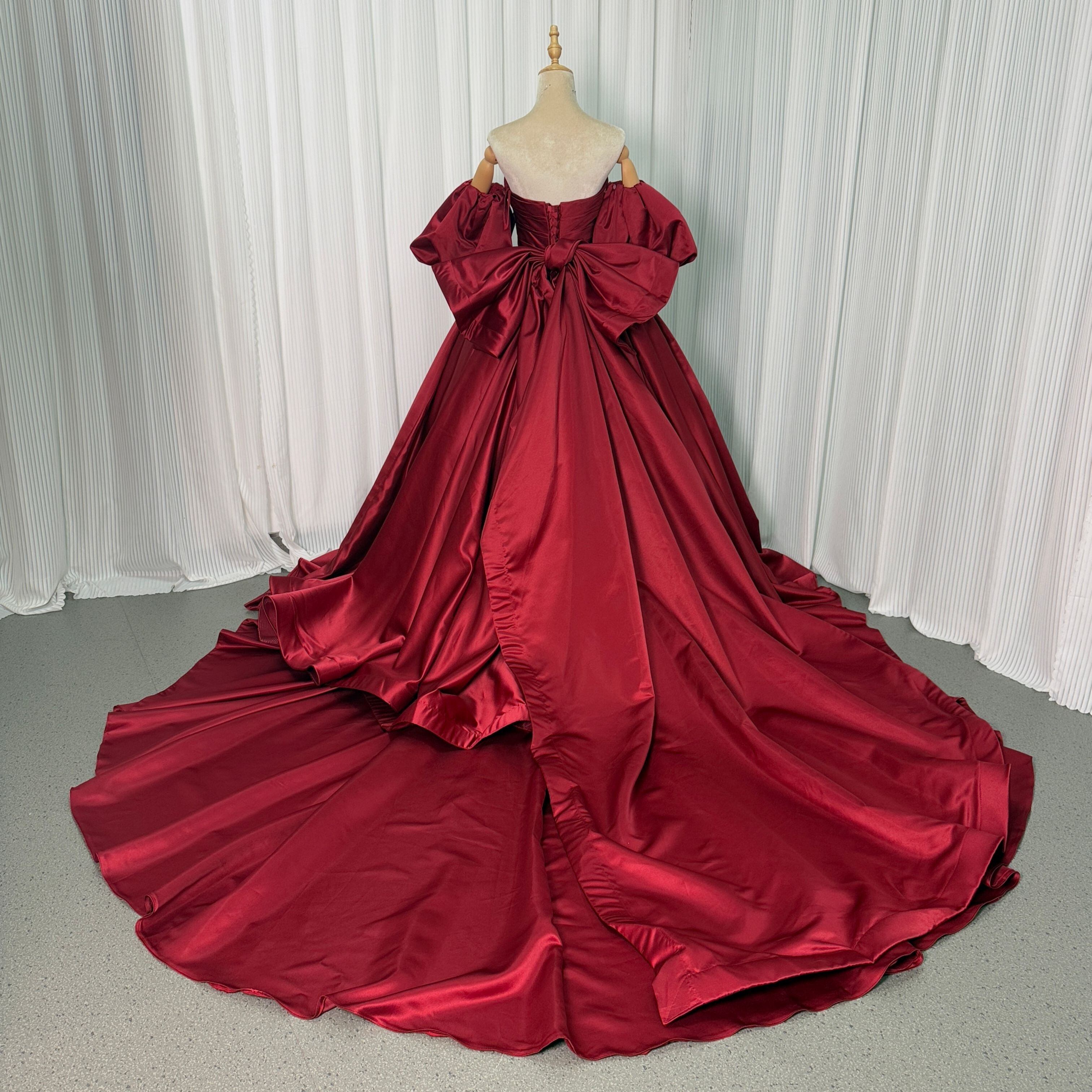 カラードレス ボルドー色 ふっくら柔らかなバックリボン パフスリーブ 光沢サテン 華やかなトレーン 編み上げ 結婚式