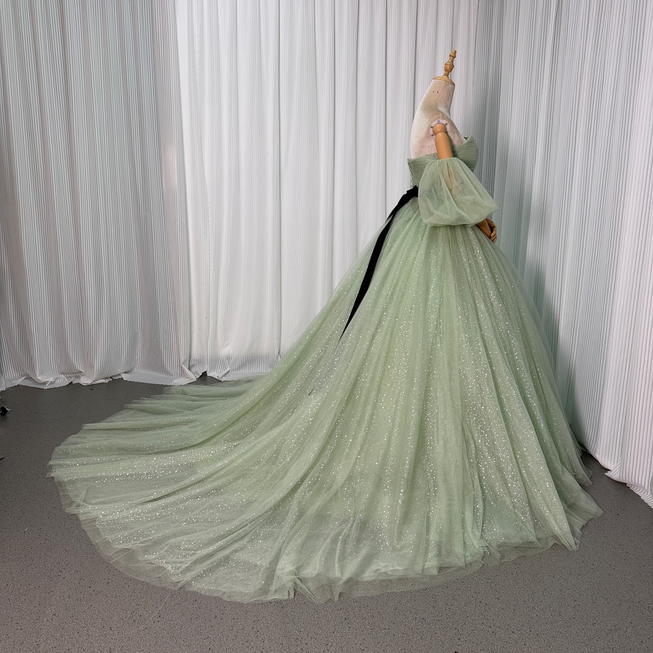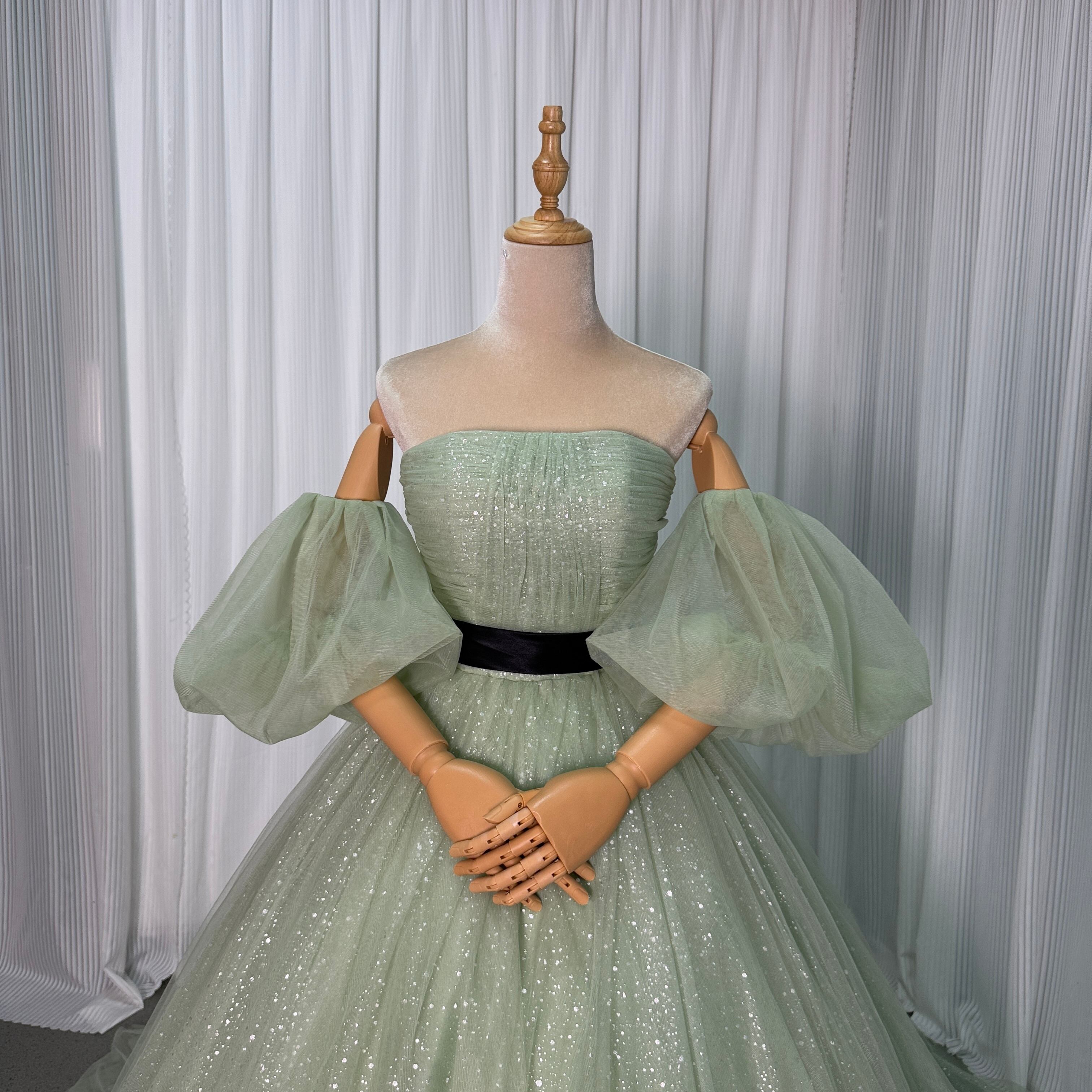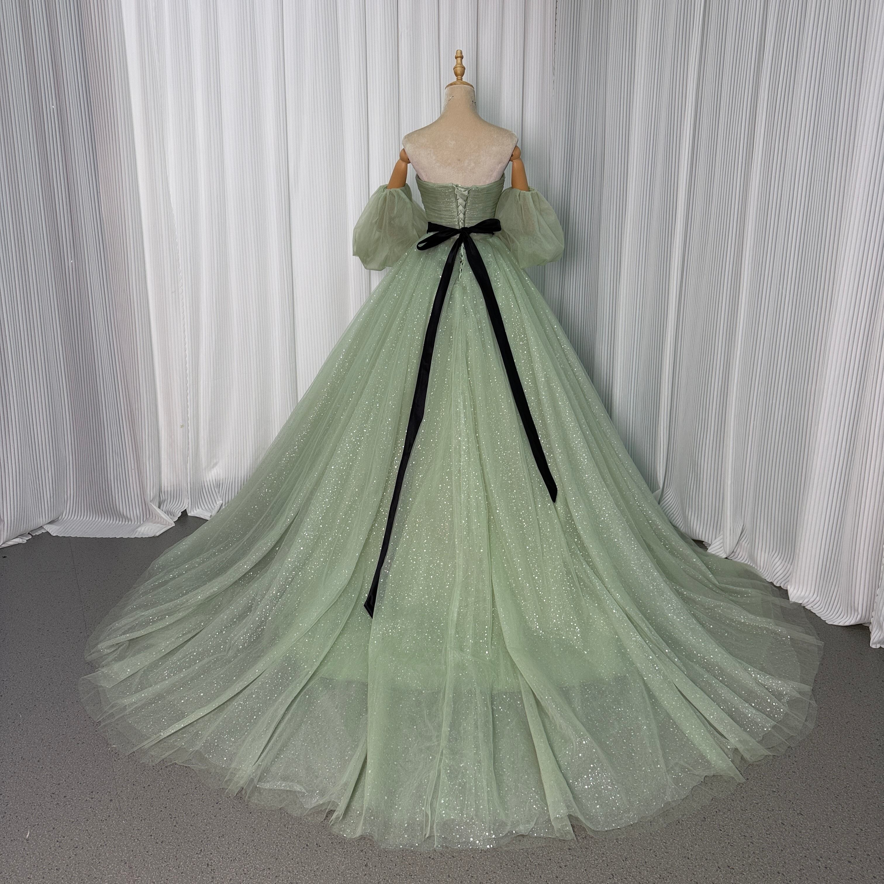 カラードレス ミントグリーンドレス 取り外し可能な付け袖 サッシュベルト シークインチュール 編み上げ 華やかなトレーン 結婚式