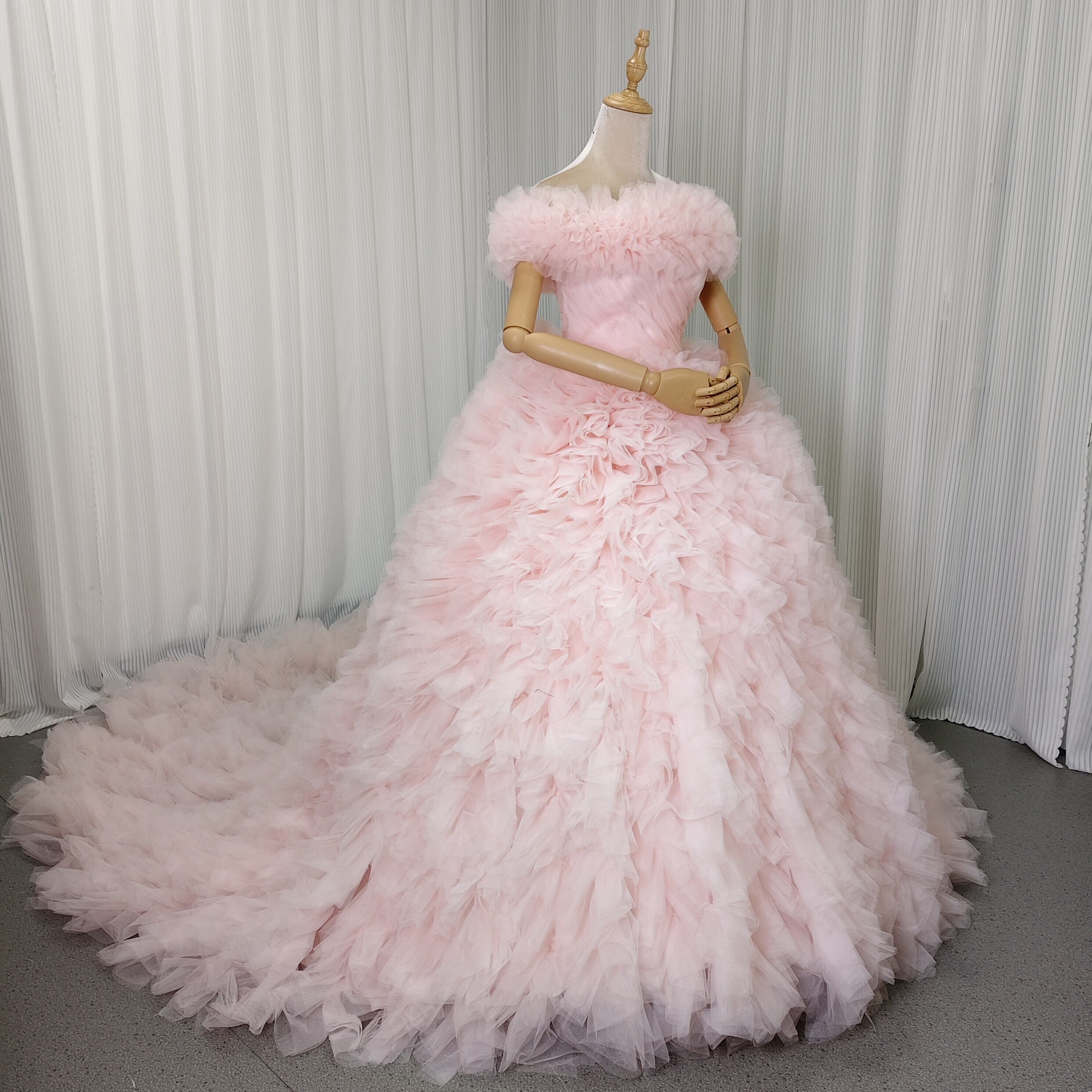 カラードレス ピンク 取り外し可能なオフショルダー 柔らかく重ねたチュールスカート 編み上げ 華やかなトレーン ソフトチュール もこもこドレス 結婚式