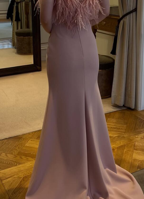 カラードレス ピンク フェザー ベアトップ 光沢サテン ソフトマーメイドライン 短トレーン 花嫁 前撮り