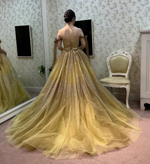カラードレス ゴールド リボン風オフショルダー キラキラグリッターチュール 編み上げ 華やかなトレーン 花嫁 前撮り