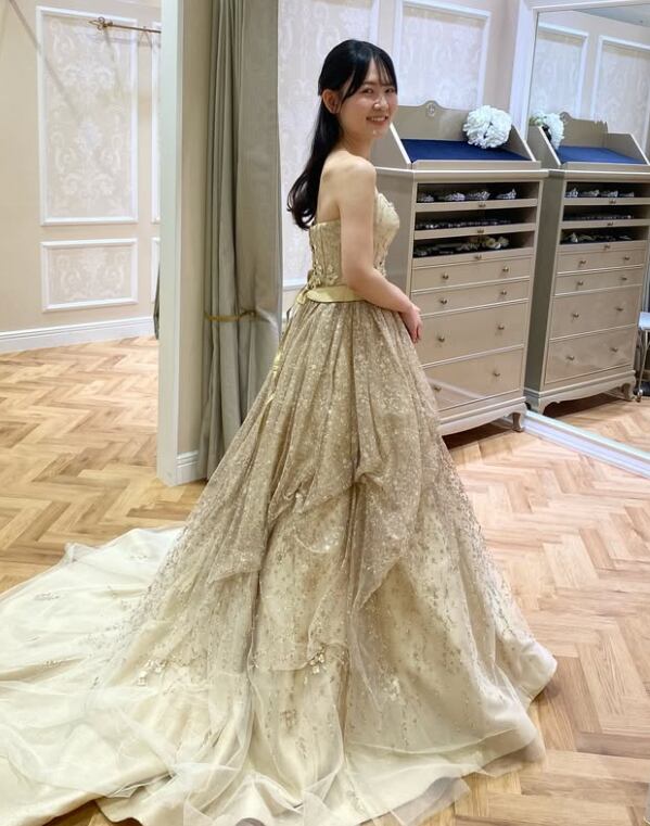 カラードレス 薄シャンパンの色 キラキラ光る刺繍 ベアトップ 3D立体レース刺繍 華やかなトレーン 绮丽な 花嫁 前撮り
