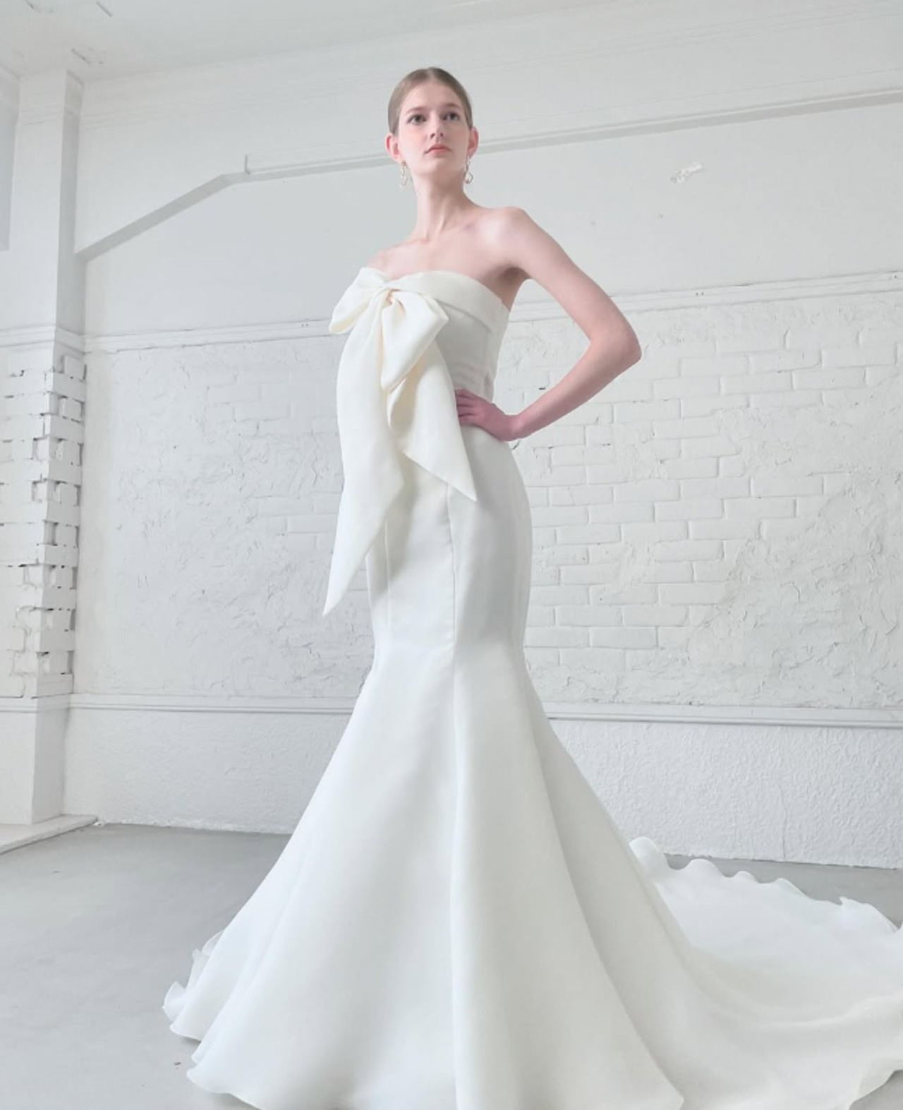 ウエディングドレス オフホワイト リボン 上質オーガンジー 編み上げ マーメイドライン 華やかなトレーン 細見えシルエット 結婚式