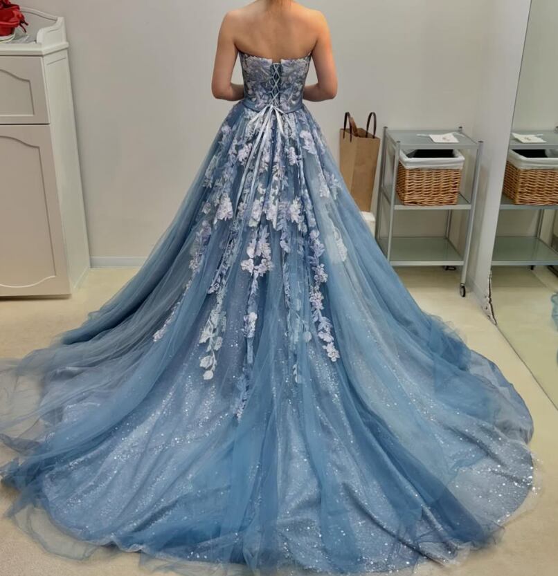 カラードレス ブルー キラキラ光る刺繍 ベアトップ 華やかなトレーン ソフトチュール エレガント 花嫁 前撮り