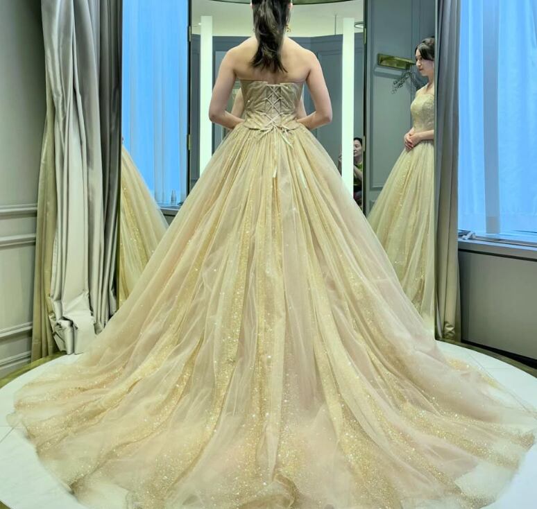 カラードレス ゴールド ベアトップ 編み上げ キラキラグリッターチュール 目立つ 華やかなトレーン 花嫁 前撮り