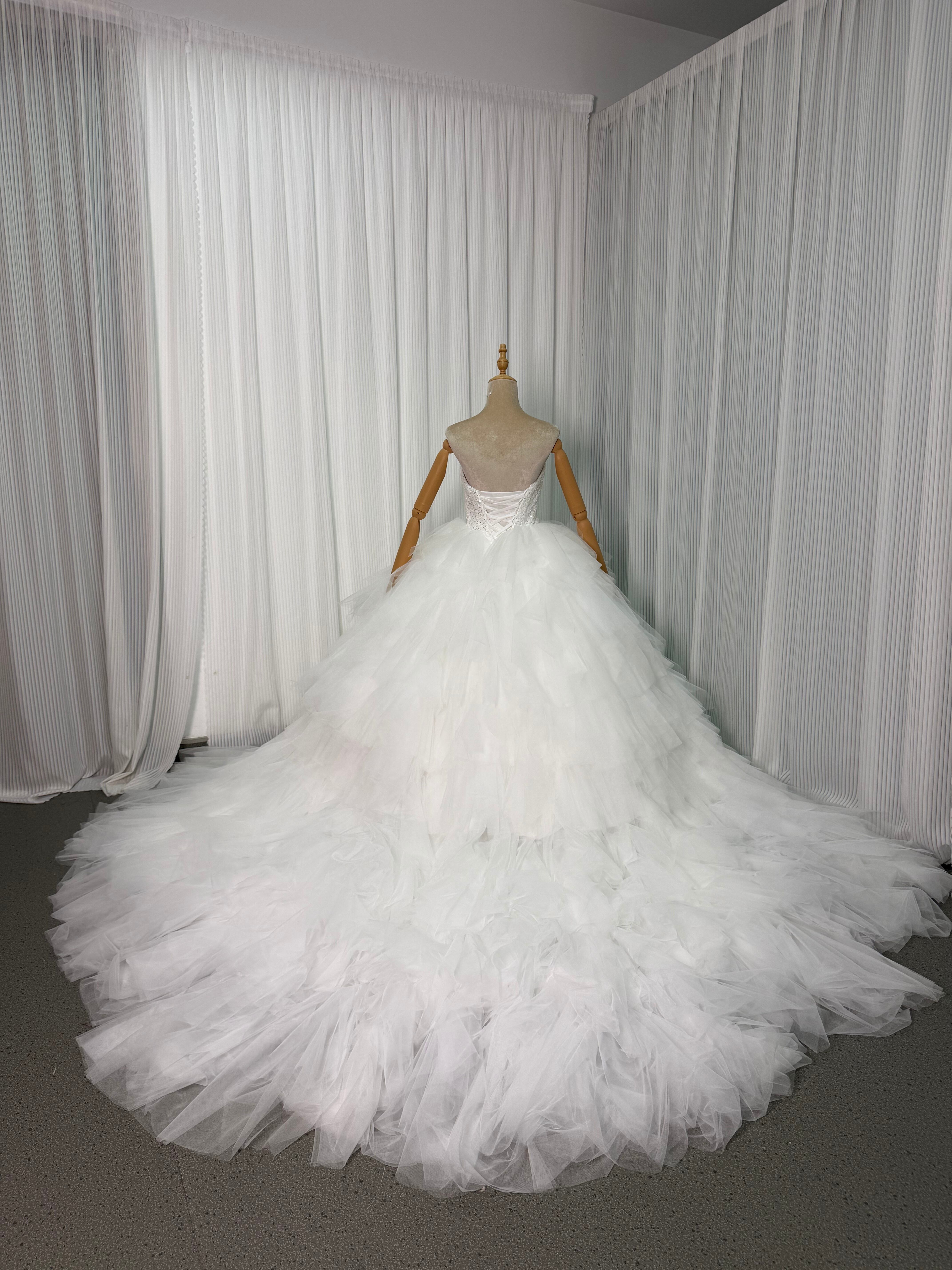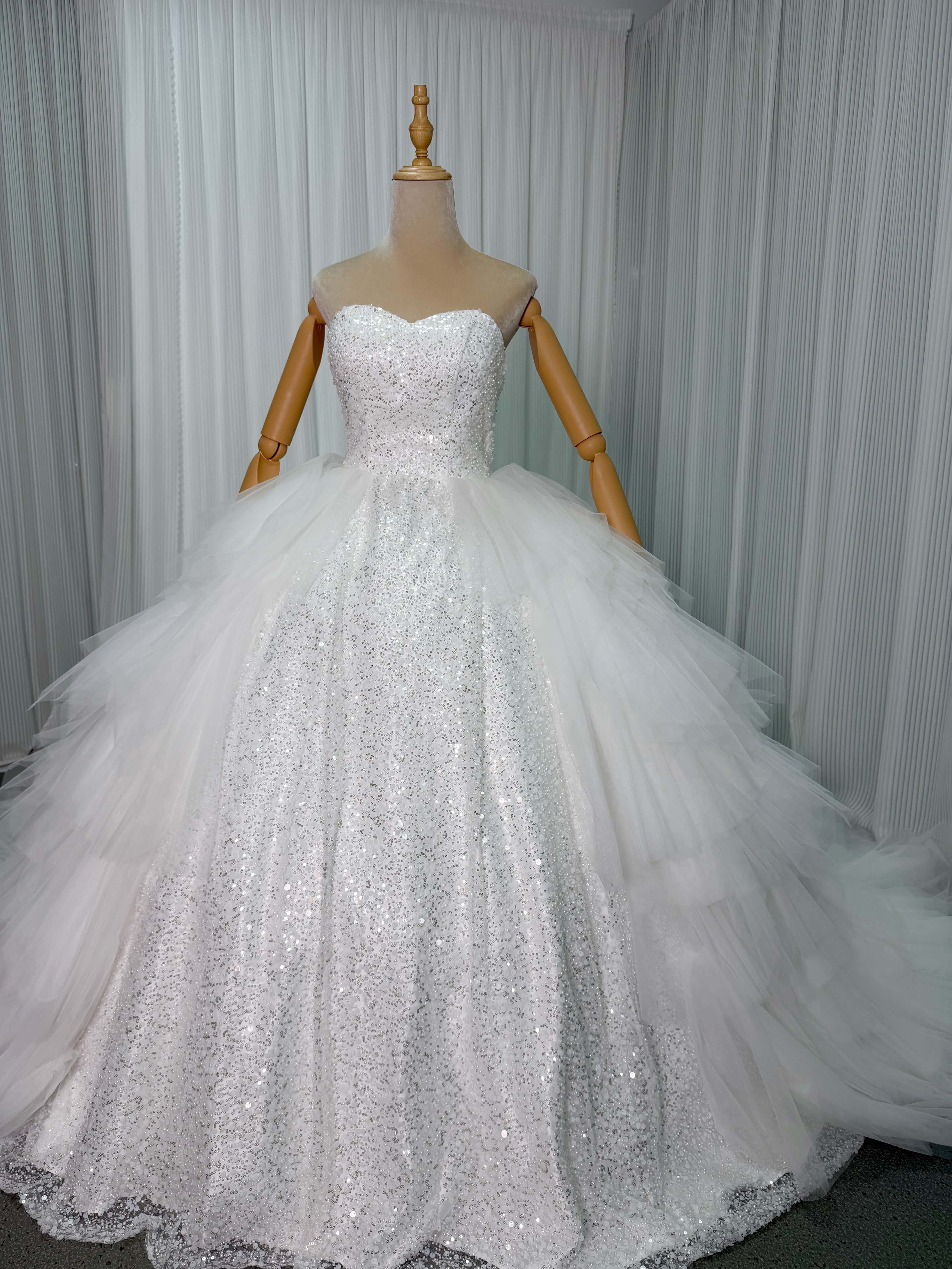 ウエディングドレス オフホワイト シークインチュール 編み上げ 韓国風ドレス 華やかなトレーン ビスチェドレス 結婚式