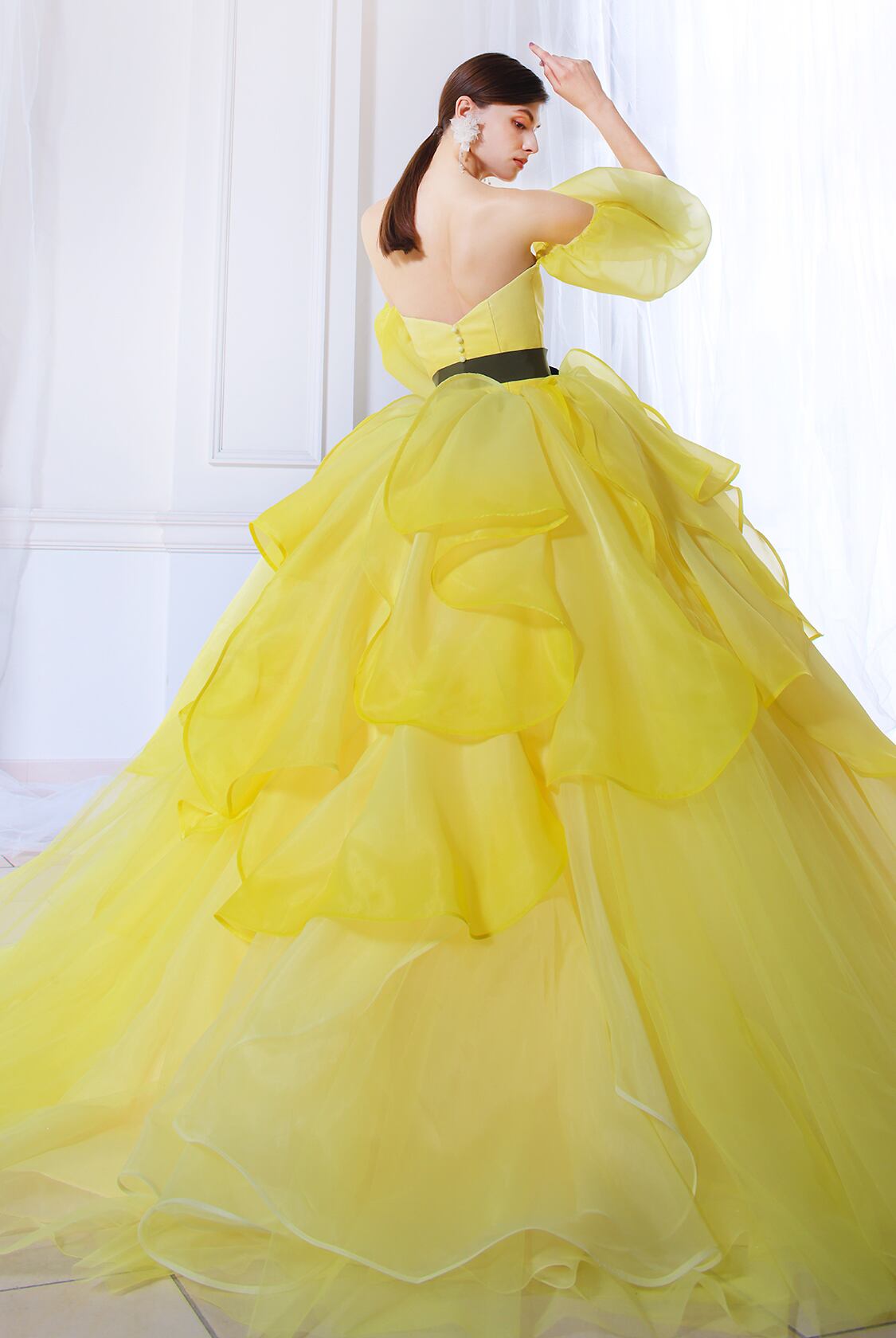 カラードレス 黄色い フリルオフショルダー ラッフルフリル ふわふわドレス 目立つ 色直し 披露宴/結婚式