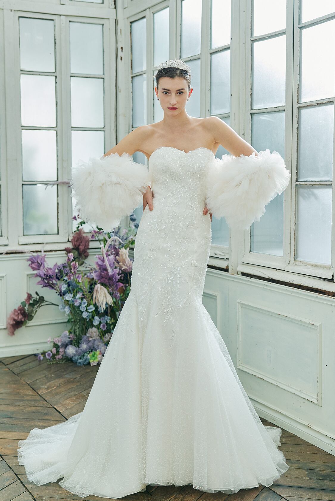 ウエディングドレス オフホワイト キラキラ光る刺繍 ベアトップ マーメイドライン ケープ風ドレス 結婚式