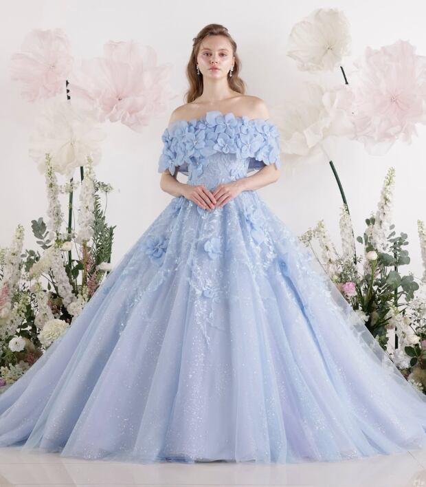 カラードレス 爽やかで優しいブルー キラキラグリッターチュール 3D立体レース刺繍 取り外し可能なオフショルダー 華やかなトレーン 憧れのドレス ブライダル