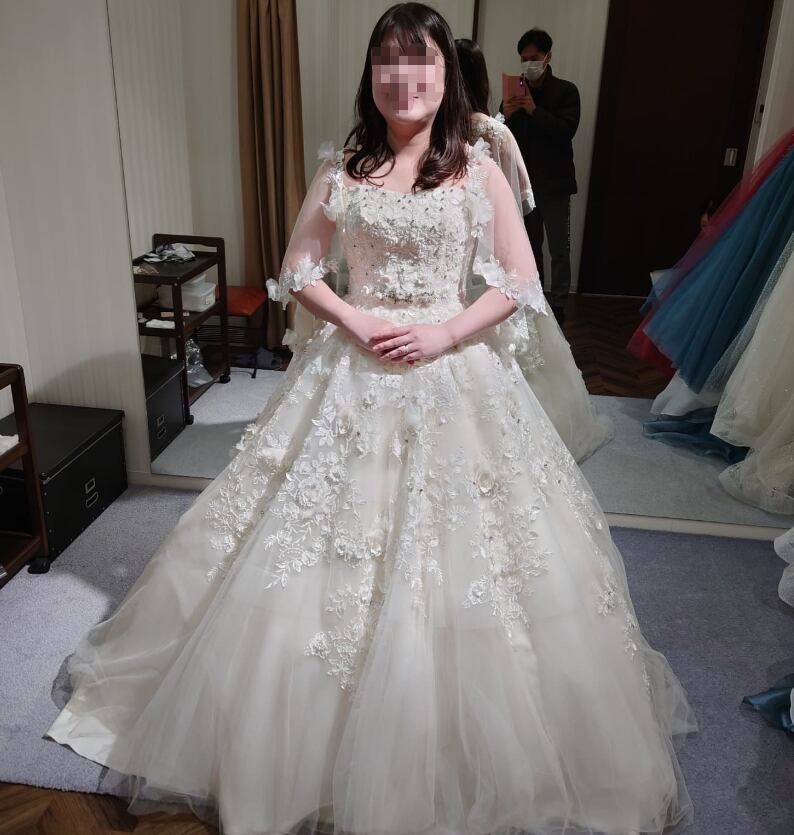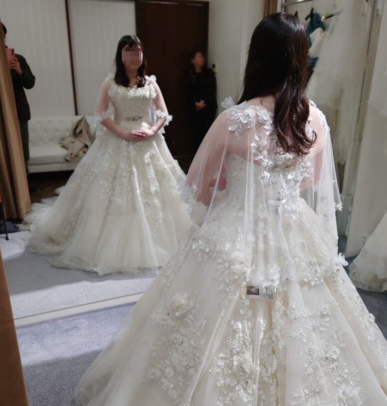 ウエディングドレス オフホワイト 韓国風ドレス 花柄モチーフで刺繍が美しい ケープ風ドレス 編み上げ 華やかなトレーン 結婚式