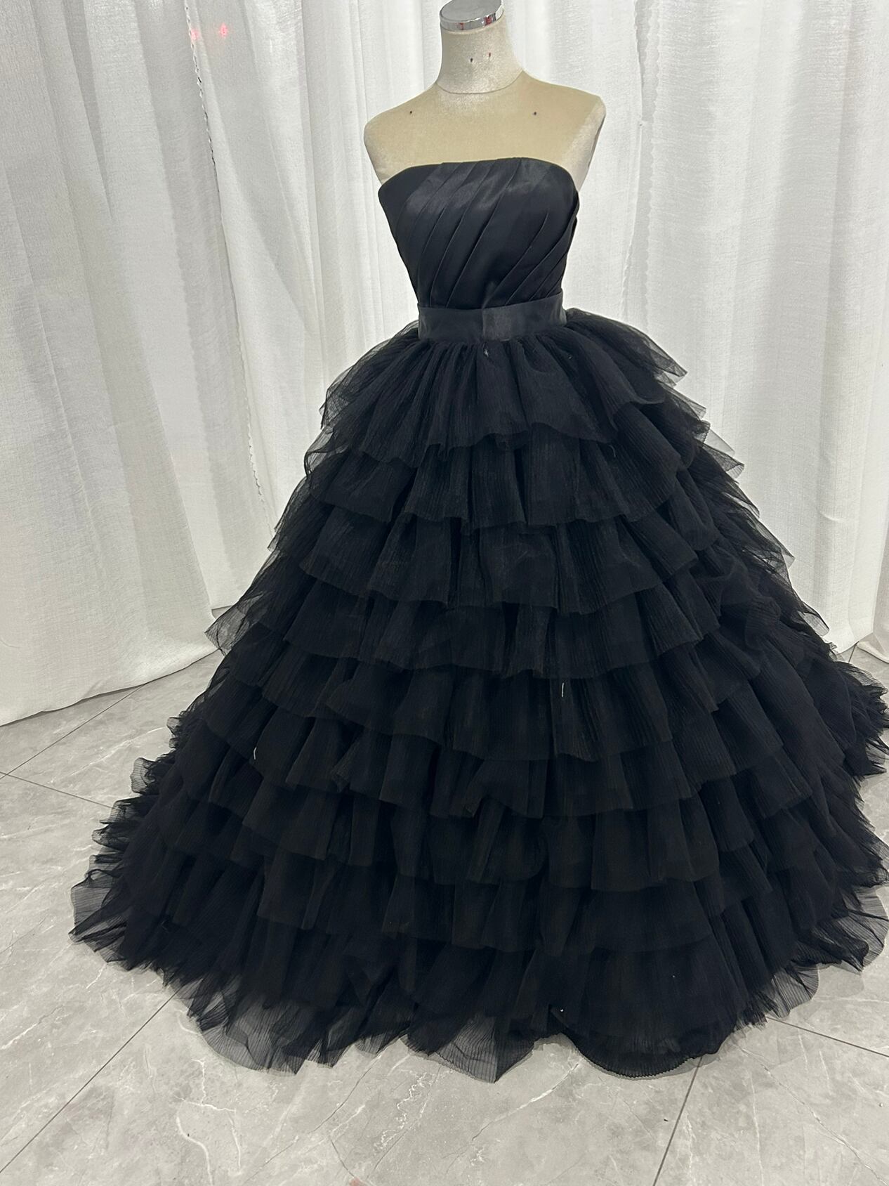 カラードレス ブラック 編み上げ 柔らかく重ねたチュールスカート 短トレーン ビスチェドレス 結婚式 前撮り